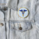 This Nursing Caduceus features golden snakes twined around a light blue staff with deeper blue upraised wings and large letter N.