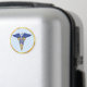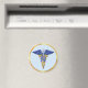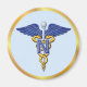 This Nursing Caduceus features golden snakes twined around a light blue staff with deeper blue upraised wings and large letter N.