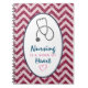 A spiral notebook with a red chevron faux glitter pattern. Not actual glitter, just an image. Layered over top inside an oval is the saying: Nursing is a work of heart. Designed with a little pink heart and a gray stethescope.