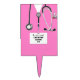 Creative, easy-to-personalize medical themed nursing school grad cake topper featuring pink hospital scrubs, stethoscope, and Swiss Army Knife. Edit text to add nurse's name.