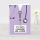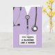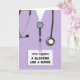 Personalized nurse graduation card design featuring lavender hospital scrubs for nursing school grad. Edit text to add name.