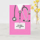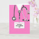 Creative nurse graduation card featuring pink hospital scrubs. To personalize edit text to add name of nursing school grad.