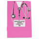 Creative nurse gift bag featuring pink hospital scrubs, stethoscope and a Swiss Army knife. Edit text to add nurse's name.