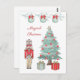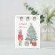 Christmas Postcard featrues a watercolor illustration of Nutcracker, Christmas tree, baubles and presents. On the reverse side - Christmas Nutcracker and rocking horse