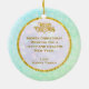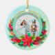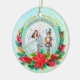 Description: Celebrate the magic of the holidays with this enchanting personalized Christmas ornament! Featuring a beautiful illustration of Clara from The Nutcracker ballet holding her beloved Nutcracker, alongside a festive Christmas tree and vibrant poinsettias, this ornament is a perfect keepsake. The front can be customized with a name (e.g., "Olivia as Clara") and the year, making it a truly unique memento. The reverse side carries a heartfelt "Merry Christmas! Wishing you a Happy and Healthy New Year. Love [Your Family Name]" message, surrounded by sparkling gold accents and a beautiful bokeh background. Crafted from a lovely teal and snowflake border, this ornament adds a touch of classic holiday charm to any tree. It's an ideal gift for ballet lovers, children, or families looking for a special way to commemorate the festive season.