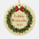 Beautiful red nutcracker doll in wreath round Fröhliche Weichnachten, German Christmas ornament. This lovely double sided holiday art ceramic ornament features a red nutcracker in the center of a holiday wreath with pine cones and berries! The back also has a lovely wreath and bow with the words "Fröhliche Weichnachten" - Merry Christmas in German language, and the year! A wonderful addition to your ornament collection, holiday decor and a great gift for family, friends and someone who loves the nutcracker!