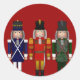 Christmas Nutcracker Trio -Three Nutcrackers standing side by side on top of a solid red background. The first nutcracker is dressed in blue and white with gold embellishments. The center nutcracker is dressed in red and gold with gold embellishments. The third nutcracker is dressed in green and white with silver embellishments. Each one of these nutcrackers are available separately on assorted Zazzle gifts and products.