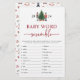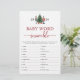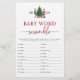Nutcracker Word Scramble Game. This cute and unique holiday nutcracker baby shower game features hand-painted watercolor nutcracker toy soldiers, a beautiful Christmas tree, and a whimsical matching pattern on the back. Find matching items in the Christmas Holiday Nutcracker Collection. (Key - 1. diaper, 2. stroller, 3. pacifier, 4. baby, 5. precious, 6. rocking chair, 7. crib, 8. milk, 9. car seat, 10. nursery, 11. formula, 12. stork, 13. bundle of joy, 14. lullaby, 15. blanket, 16. high chair, 17. shower, 18. teddy bear, 19. bibb, 20. rubber ducky)