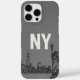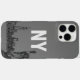 iPhone case featuring centered and reduced-size "NY" graphic, vibrant background, and black line art skyline with Statue of Liberty.