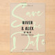 Acrylic typography save the date card with a modern script in nyanza green printed across the whole card and your names in bold black letters centered on the modern acrylic save the date card without a photo.