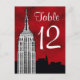 Customizable Invitations and accessories with a silhouette of the New York City skyline featuring the Chrysler Building and an etched ESB in the foreground. They also feature a red starry night background with white stars.