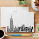 Elegant, stylish, chic customizable invitations and accessories with an iconic view of the New York City skyline, featuring an etched look photo of the ESB and Chrysler Building and rear view of the Flatiron Building on a white background.