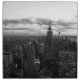 The classic New York City skyline at sunset viewed from midtown Manhattan, including the ESB, with a view south all the way down to the World Trade Center. The photo is in black and white.