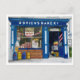 A watercolor of a colorful, nostalgic bakery in Ireland. The white and blue building contrasts with the colorful array of goods in the shopwindow and the doorway.