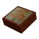 The stunning gift box is made of golden oak, with a hinged top. It features a craftsman-style tile with an oak tree in green and copper.