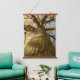 Tapestry with photo of oak tree looking up at huge ridged trunk and branches and crown of yellow leaves with blue sky behind