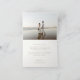OASIS, folded wedding photo thank you card. Features, palm tree illustration, template text lines for your names and personalized message in neutral taupe typography with light sandy beige color backgrounds.