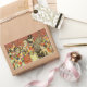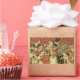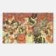 This beautiful tortoiseshell mother cat and and her seven kittens all have ornate multicolored markings in various shapes, reminiscent of those found on painted Oaxacan animal carvings. The little family is comfortably curled up on a flowered cloth in a cozy wooden basket. The entire scene is surrounded by a detailed Mexican-style border.