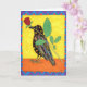 This beautiful crow is covered with multicolored markings in many different shapes reminscent of those found on painted Oaxacan animal carvings. She stands on a vibrant orange surface against a vivid yellow background, holding a red rose in her beak. The entire scene is surrounded by a detailed Mexican-style border.