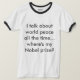 t-shirt: "I talk about world peace all the time... where's my Nobel prize?"