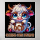 A funny and sarcastic colorful design showcases an adorable highland cow sitting with a steaming coffee mug labeled "O C D." The cow, with big blue eyes, glasses, and a concerned expression, sports brown and white fur. The vibrant text reads, "Obsessive Coffee Disorder." This quirky design is available on a wide range of products, making perfect gifts for coffee enthusiasts.
