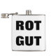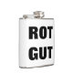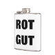 Obvious label flask says ROT GUT in big, plain, simple, easy to read letters so that you never mistake your fruit flavored soft drink flask for your booze. (Those sugary soft drinks will kill you!) Great way to carry your high octane hooch around with you.
