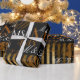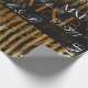 A memorable pattern made with their initial-letters repeated on a black and golden striped background