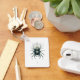 A small round keychain displaying a detailed dark biomechanical spider design. The intricate teal and black arachnid has a single central golden eye. The background features faint circular occult symbols, sacred geometry, and subtle paint splatters. Perfect as an edgy accessory for keys, bags, or backpacks. Great gift for gothic, metal, and industrial style fans. Durable acrylic with a silver ring.