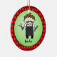 Funny cartoon drawing of a male hair stylist with mustache, holding a comb and scissors, wearing an apron. Background is a green "bubble" on red and black argyle pattern. Reverse side is ready for your custom date - you can even add a name or other text to create your own unique one=of-a-kind professional ornament. From Ornament Central. Drawing courtesy of Lettering Delights, com.