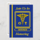 This blue and gold invitation is decorated on the front with the retired Occupational Therapist caduceus shield. You can customize this card by placing your information into the boxes provided.