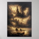 A small ship on the sea, many cloud on the sky with a castle located on some of the cloud. This is a AI generated art.