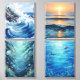 This collection of ocean art prints explores the dynamic shapes and beauty of the blue ocean. Each design captures the movement of waves, reflections of sunlight, marine life, and the depths of the sea, all rendered in a semi-abstract painterly style.