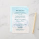 Wedding menu with ocean beach background. Light blue water, sea foam, and beach sand is the background for custom, teal blue text. The names of the bride and groom are in the center of the paper. Customize four sections with menu information.