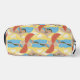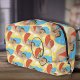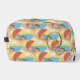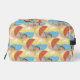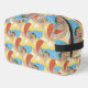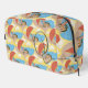 Beach chair and umbrella artwork pattern toiletry bag with single initial template for personalizing. Gift to bridesmaids, or anyone who loves the beach. Warm, earthy colors on this makeup bag with a repeating pattern and summer vibe that reminds one of a summer day by the sea. Colors are blue, beige, yellow and off-white and cover all areas of this bag with a zipper. Size is 9x8x4 - see description for more info. The pattern will transfer to other bag styles, but the initial template may be off and need to be removed.