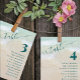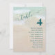 Beach wedding reception, table seating chart cards that list the guests at each table. List names with corresponding table number to hang at the reception, in a decorative manner. Guests can peruse the cards and then find their table. Swirling "table" text is angled at the top over a beach sand background image. Text is dark teal with bold number and names aligned to the right. Name list will hold 8-12 names. The design can be customized and downloaded to print out yourself, or choose a paper type and place an order to get a printed collection of table number card.