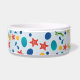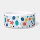 Colorful cute pet bowl with starfish, shells and pebbles, sea weed for summer. Dive into the soothing rhythm of the waves with our Uplifting Ocean Beach Pattern.