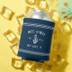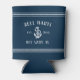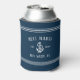 Upgrade your boat beverages with these cool personalized can coolers in bright navy blue. Design features your boat name, ship's registry, and year established in white lettering, accented with an anchor illustration and rope stripe detailing at the top and bottom.