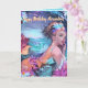 Watercolor mermaid in the sea birthday card. This watercolor design has lots of blue and pink. The background has ocean waves and a colorful sky. The mermaid is wearing her hair up with a headband of flowers. Dive into enchantment! Perfect for mermaid lovers. Brighten someone's day with this stunning card.