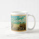 This Greetings From Ocean City vintage postcard design features a sandy beach with a beautiful turquoise ocean water and above the sea, a blue sky with billowy white clouds. In vintage travels style.
