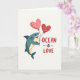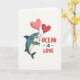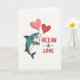 This greeting card features a friendly teal shark swimming along the left side, smiling wide with small rounded teeth and big eyes that look a little shy 🥰. It holds two balloon strings in its fin, as if offering them to someone just off the page in a quietly romantic gesture. One balloon is a coral pink heart with white polka dots, and the other is a deep red heart with tiny white accents ❤️. The background stays off-white and simple, so the sea colors and hearts stand out without crowding the scene. On the right, the text “OCEAN IS LOVE” sits in red, with a neat sans‑serif look that’s easy to read. The word “is” is decorated with little wave shapes, tying the message back to the ocean theme. The balloons float upward at a slight angle, with thin gray strings curving gently toward the shark’s fin.