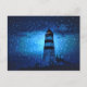 An avocative image with nautical and seascape theme. A lighthouse a stormy night with dark clouds and rain. A light can be seen in the lighthouse tower. A dark blue image covered with drops, raindrops or ocean spray