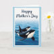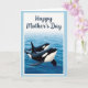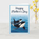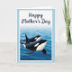 This card shows two large marine mammals with black-and-white markings gliding through calm blue water, with the larger one in front and the smaller one tucked close behind like a gentle, protective pair ❤️. Soft ripples spread around them, and a smooth dark fin breaks the surface near the foreground. The sea shifts from deep blue around their bodies to a lighter blue toward a hazy horizon, giving the scene an open, airy feel. A diffused light washes over the water and their sleek backs, adding a quiet tenderness to their side-by-side movement. The illustration sits inside a white, torn-edge style border that looks like textured paper, adding a cozy, keepsake touch. Above the ocean scene, the words “Happy Mother’s Day” appear centered near the top in dark navy lettering, standing out against the pale background 🌼. A soft, pale blue margin frames the whole design, and the white border remains visible around the picture like a gently ripped photo edge.