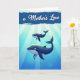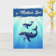 This greeting card shows a calm underwater scene where two large marine mammals glide close together, their bodies angled as if sharing a quiet, protective moment ❤️. The larger one rests near the lower area, dark and gently contoured, with a watchful eye turned slightly left toward its companion. Just above and behind, the smaller one swims in the same direction, tucked close as if drawn in by trust and closeness. Pale aqua light beams pour down from the top, fading from bright blue near the surface into deeper indigo below, giving the water a soft glow. The animals’ smooth dark backs contrast with ribbed white undersides, adding texture without crowding the scene. Near the top sits a dark blue, lightly textured banner with the main message centered on it in a lighter blue font, leaving wide open water around the words 🌼. Subtle shading around the larger animal’s eye suggests a tender, protective focus rather than a stern look. The background remains uncluttered, with the strongest light rays concentrated at the upper center and tapering as they reach the pair.