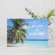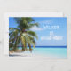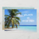 Welcome to class, message from teacher cards. Personalize with text on front and back. The image is tropical blue ocean water and a palm tree. Sample text is, “Welcome to Any grade”. On the back, create a message to the student over a beach sand image.