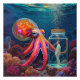 "Ocean’s Silent Captive" – Colourful Octopus Portrait. In a surreal ocean world, a giant octopus watches a lone man trapped inside a glass jar. This evocative scene explores themes of confinement, the vastness of nature, and the fragile barrier between freedom and captivity. The vibrant colours and intricate details invite deep reflection on human vulnerability beneath the waves.