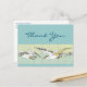 An editable thank you card with script letters and vintage tile art of seagulls flying over a calm ocean sea, in pastel hues on an ocean teal background on the front, and your custom return address on the back. Art restored and reproduced from an antique tile pattern.