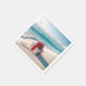 A silver Christmas gift with a large red bow sits on a sandy beach with turquoise ocean surf.