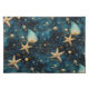 A cloth place mat with an elegant blue pattern with starfish, representing the ocean.