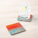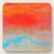 An abstract design of an ocean sunset with bold colors in red, orange, cyan, blue, and beige.