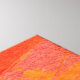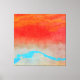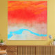An abstract design of an ocean sunset with bold colors in red, orange, cyan, blue, and beige.